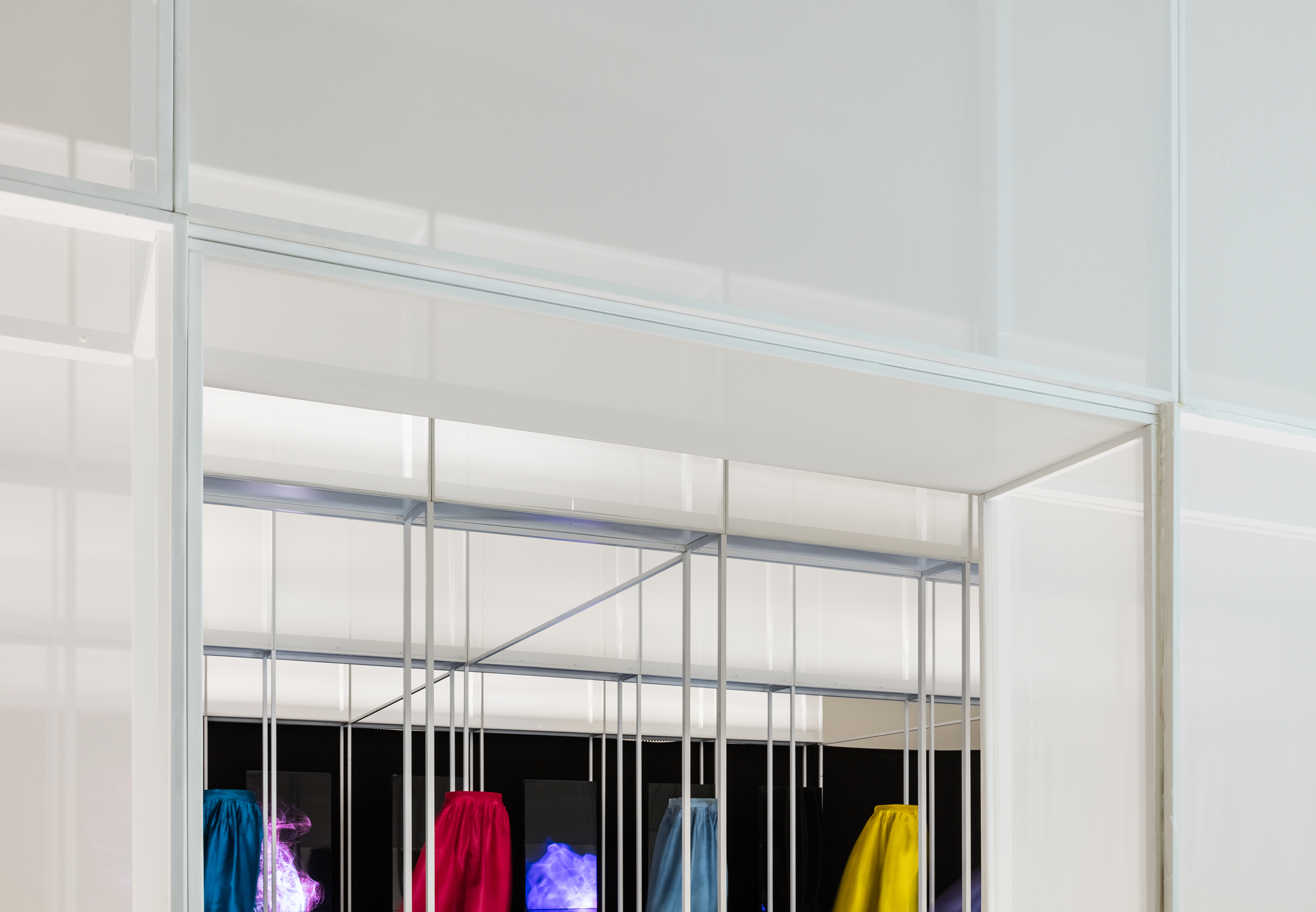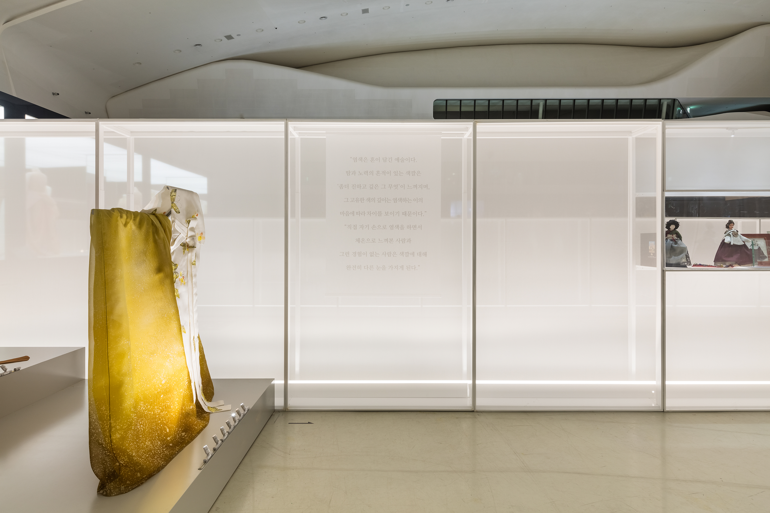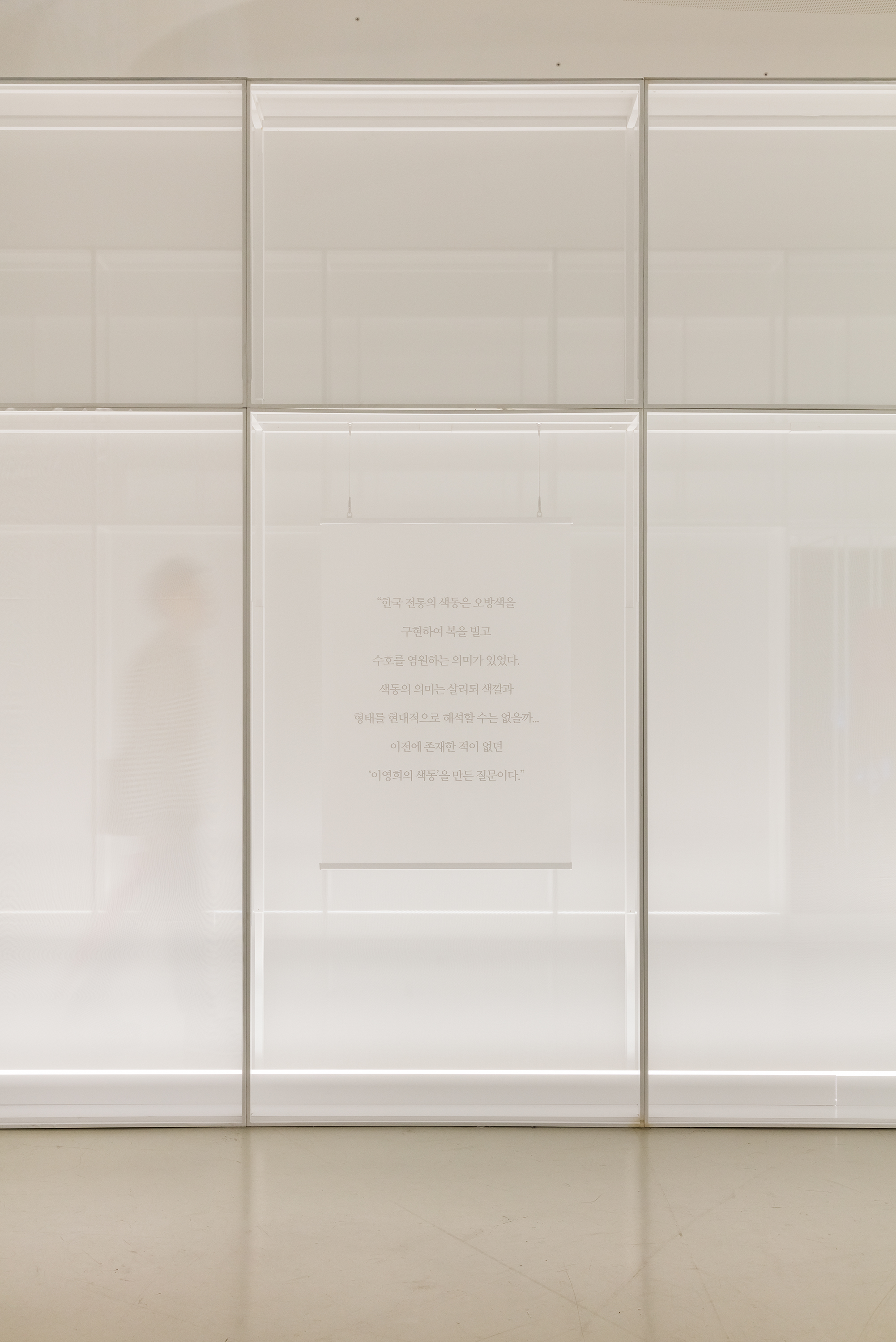 For a special exhibition entitled Baram-Baraem, by the celebrated hanbok designer LEE Younghee, I was put in charge of designing the exhibition space. My goal was to create an exhibition space that would best capture and show the unique characteristics of hanbok. The central feature of the exhibition space for conveying the beauty of the hanbok, as I envisioned, were “walls” made of two layers of semi-translucent organza, which is a delicate silken material. The layers of the organza simulated the fog and clouds that hang over the landscape of mountains and forests or rural Korea.
