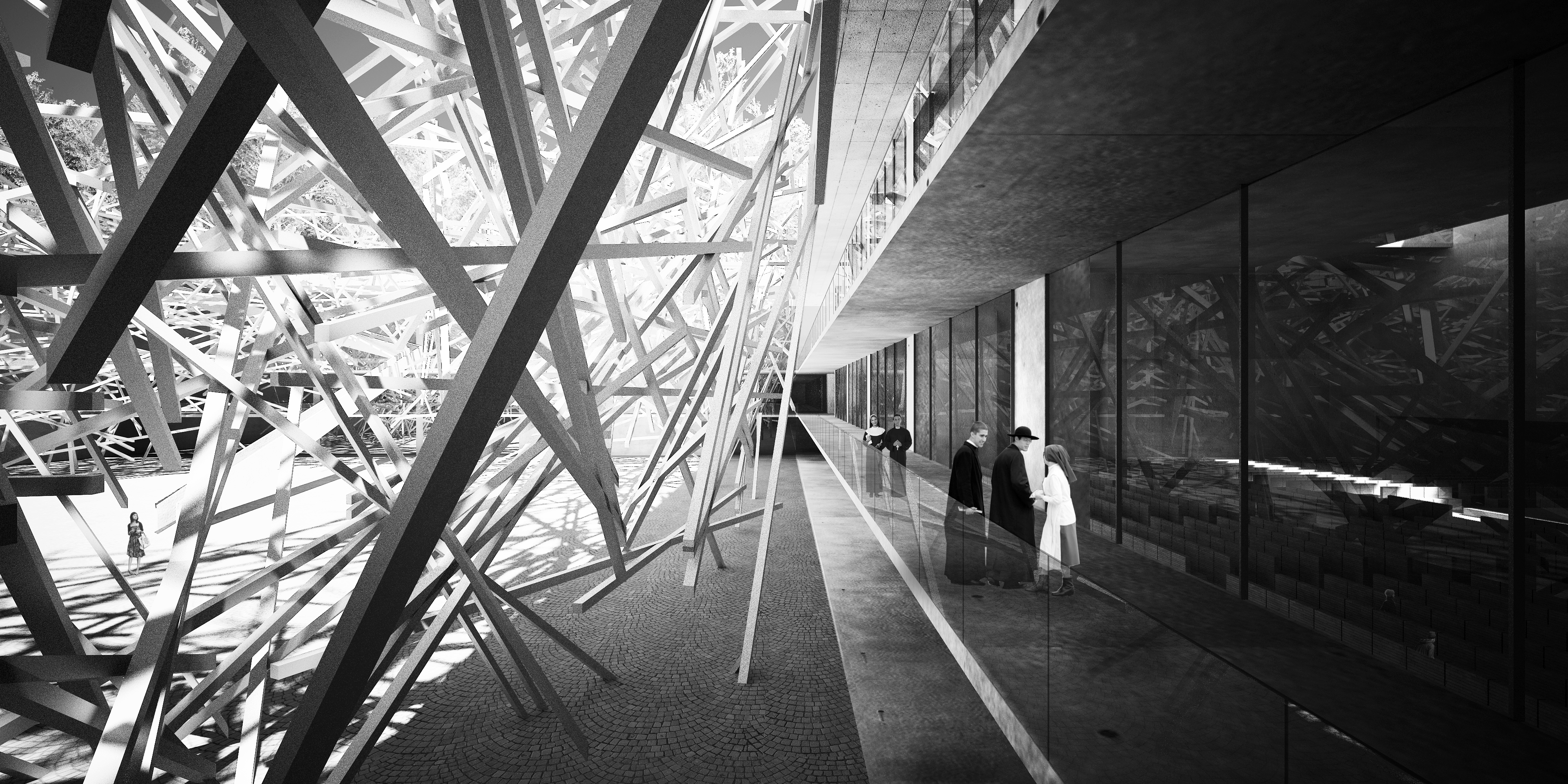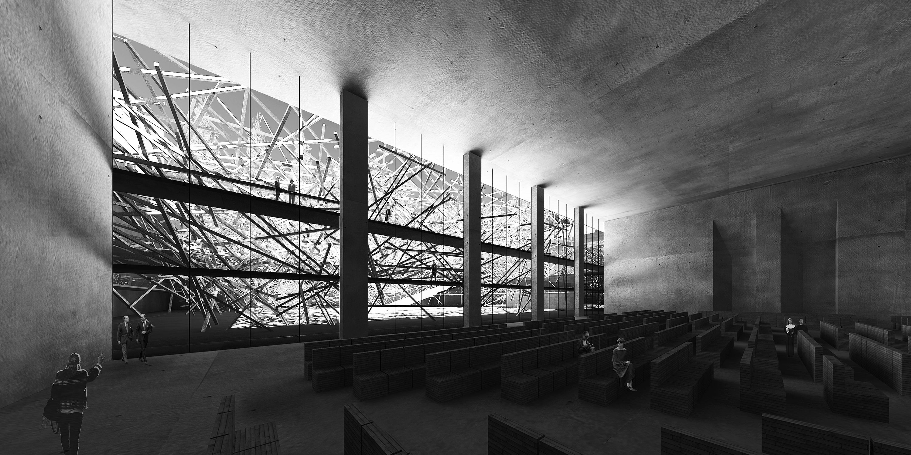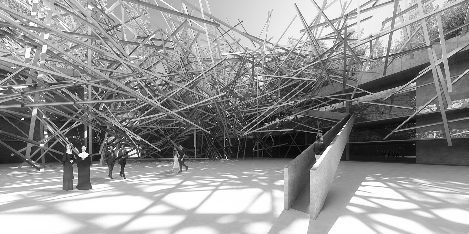 The interplay of light and shadow through randomly layered thorns converge inside the church as one holy spirit where the spirits of saints are vividly remembered. A narrow path leads visitors through the thorns towards a large park with vertical poplar trees in a strict grid formation. It is a space of the Resurrection, bliss of life itself. Indifferent to what has happened, the nature transcends time and moves