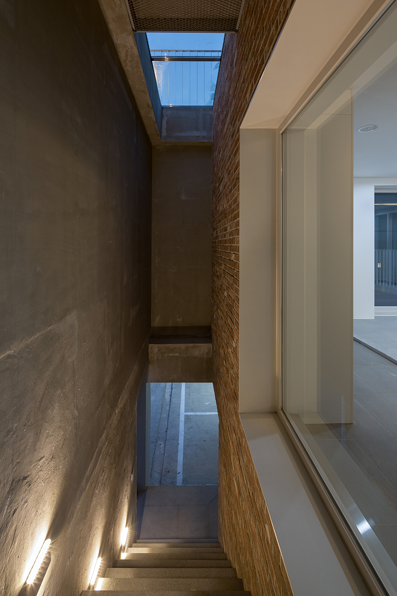 The complex conditions of the site, including the position of the entryway, the sloping land with a maximum height difference of six meters and the building coverage ratio of just 20%, provided clues for finding the optimum design. Half of the entire building is buried in the ground, while the other half reveals itself above the surface of the yard. Poly house makes active use of ambivalent spaces where interior meets exterior or where such boundaries are inverted. This raises the contact surfaces inside the house and minimizes visual severance between the inside and the outside. In contrast to the simplicity of the form visible from the outside, the irregular elements on the inside create diverse views. Gaps and ambivalent spaces allow users to experience not a flat living environment but an intimate living space.
